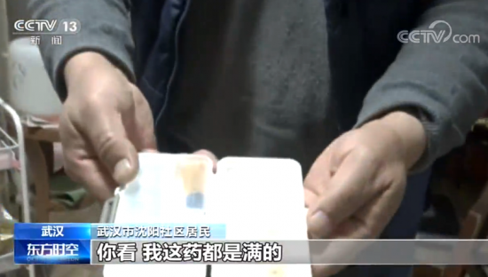 武汉市江岸区的沈阳社区居民:这都是他们给我开的药,你看,我这药都是满的。冰箱是满的,你看排骨,你看他们给我们送来的菜,给我们买的菜,物资都有。