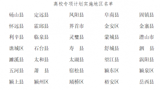 安徽省高校专项计划实施区域为安徽列入国家集中连片特殊困难县、国家级扶贫开发重点县、省扶贫开发工作重点县(市、区)和省扶贫开发连片地区县(市、区),共35个。报考高校专项计划的考生,本人及父亲或母亲或法定监护人户籍地应在实施区域的农村,本人具有当地连续3年以上户籍,在户籍所在县高中连续3年学籍并实际就读,且高考成绩达到报考院校所在批次线。