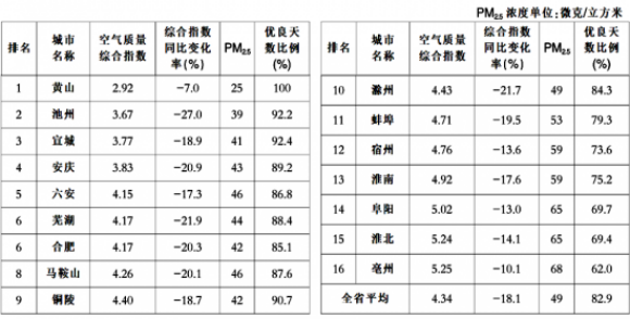 注:(1)空气质量排名采用空气质量综合指数大小来确定,指数越小表明空气质量越好,指数相同的城市以并列计。 (2)空气质量综合指数是指评价时段内,参与评价的各项污染物的单项质量指数之和(单项指标评价时段内平均浓度与该指标二级标准限值的比值,SO2、NO2、PM10及PM2.5采用年均浓度二级标准限值、O3和CO采用日均浓度二级标准限值),指数越大表明城市空气污染程度越重。 (3)空气质量综合指数同比变化率指本年度评价时段内空气质量综合指数与上年同期变化幅度,变化率大于0代表空气质量恶化、小于0代表改善、等于0代表持平。