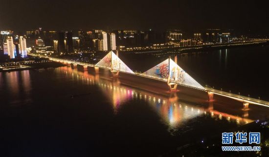 4月8日零时起,武汉市正式解除离汉离鄂通道管控措施,全市景观照明开启(无人机照片)。新华社记者 程敏 摄