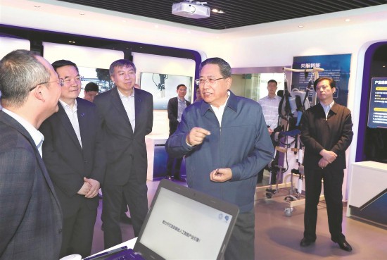 2019年5月5日,安徽省委书记李锦斌来到中国科学技术大学类脑智能技术及应用国家工程实验室,与科研人员面对面交流,详细了解类脑智能技术研究的最新进展及应用情况。(徐国康 摄)