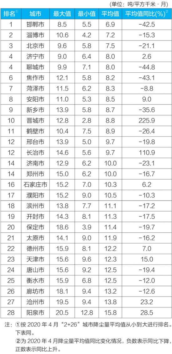 邯郸、淄博、北京、济宁、聊城、焦作、菏泽、安阳、新乡、晋城和鹤壁市等11个城市降尘量小于9.0吨/平方千米·月(《打赢蓝天保卫战三年行动计划》(国发〔2018〕22号)要求京津冀及周边地区、汾渭平原各市平均降尘量不得高于9.0吨/月·平方公里);邢台、长治、济南、郑州、石家庄、濮阳、滨州、开封、保定、太原、德州、天津、唐山、衡水、廊坊、沧州和阳泉市等17个城市降尘量平均值大于9.0吨/平方千米·月,其中阳泉市降尘量平均值最大,达15.8吨/平方千米·月。