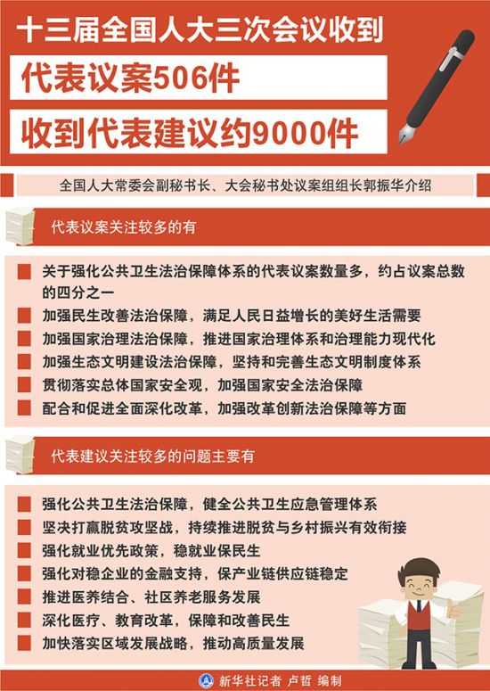 全国人大常委会副秘书长、大会秘书处议案组组长郭振华介绍,今年一个突出特点是关于强化公共卫生法治保障体系的代表议案数量多,约占议案总数的四分之一。围绕加快构建疫情防控法律体系,提出修改传染病防治法、刑法、治安管理处罚法,加大对瞒报传染病、妨碍防疫工作及非法猎杀、销售、食用野生动物等行为的处罚力度,修改中医药法、执业医师法、献血法,以及制定公共卫生安全保障等方面的法律。围绕健全国家公共卫生应急管理体系,提出修改突发事件应对法、价格法、慈善法,制定社会救助法以及战略物资储备、行政征用、信息公开、社区应急管理、现场救护等方面的法律。围绕构建国家生物安全法律法规体系,提出修改野生动物保护法、动物防疫法、食品安全法、渔业法,制定生物安全法等法律。