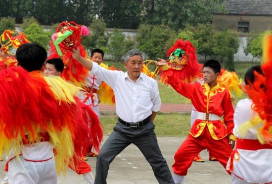全椒县六镇镇78岁的省级非遗传承人韩正平在向孩子们传授“手狮灯”动作要领。沈果 摄
