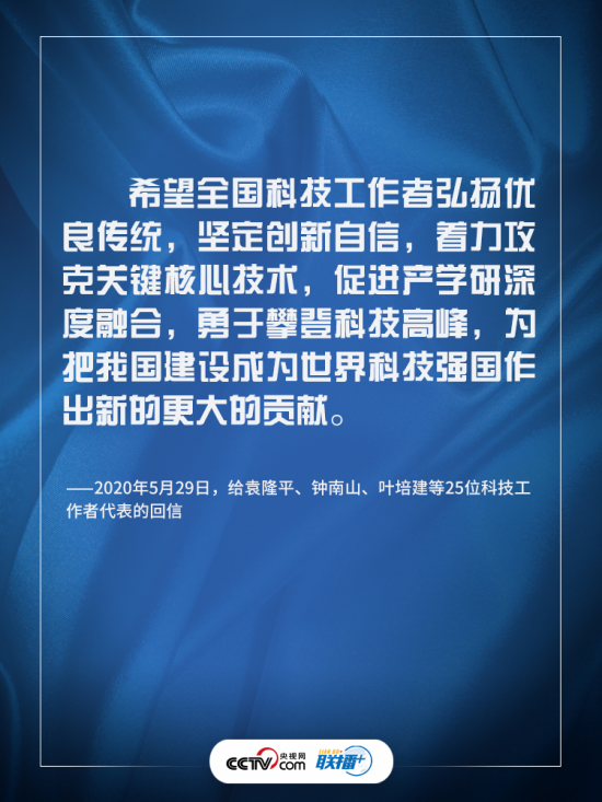 在“全国科技工作者日”到来之际,习近平总书记给袁隆平、钟南山、叶培建等25位科技工作者代表回信。在信中,他肯定了全国科技工作者迎难而上、攻坚克难,为疫情防控斗争提供了科技支撑,并希望全国科技工作者“为把我国建设成为世界科技强国作出新的更大的贡献”。