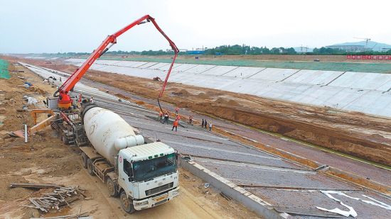 5月26日,引江济淮工程庐江县万山镇段,中铁二十局的建设者们正在进行河渠边坡筑建作业。本报通讯员柳晓华 摄
