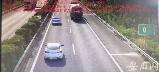 下午5时,记者从蚌埠高速交警三大队获悉,一辆江苏牌照的白色现代轿车,因为未保持最低安全距离已被抓拍,另有多辆同行为的违章车辆正在筛选中。