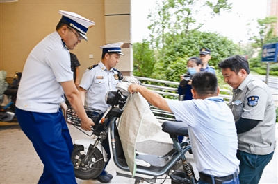 6月11日,滁城中央名邸小区,联合执法组在清理占用小区单元通道的电动自行车。当日,市消防救援支队联合城管、交警、住建等部门开展打通“生命通道”集中整治行动,对滁城部分住宅小区内及出入口处占用、堵塞、封闭消防车通道的违法行为开展联合执法,确保火灾发生后消防救援力量能及时到场处置,防止因消防车通道不畅通导致群死群伤的火灾事故发生。 记者计成军摄