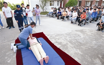 暑假临近,为防范青少年儿童溺水事故发生,6月12日,南谯区黄泥岗派出所联合1054救援队走进黄泥岗镇初级中学开展“预防青少年儿童溺水联合宣讲暨青少年儿童安全防范和法制教育活动”。活动通过防溺水知识宣讲以及现场互动演练心肺复苏、溺水救护等内容,增强学生们的安全防范意识和自救能力。图为学生们在练习心肺复苏术。
