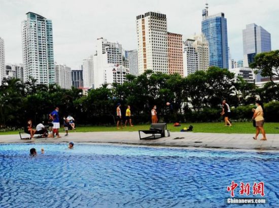6月14日,菲律宾首都大马尼拉地区的社区泳池开放,民众进行没有身体接触的户外运动。 中新社记者 关向东 摄