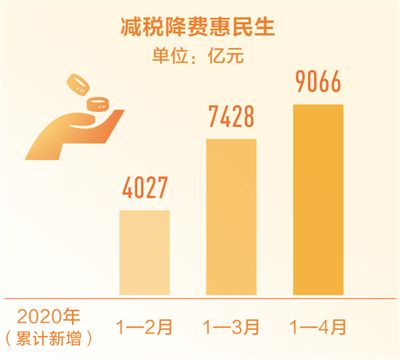 今年以来,财政部会同税务总局等部门陆续出台了一系列支持疫情防控和企业复工复产的税费政策,主要包括:对疫情防控重点保障物资生产企业给予税费优惠,对受疫情影响较大的行业企业给予税费减免,加大个体工商户和小微企业税收优惠力度等,此外还继续实施西部大开发企业所得税优惠政策,将前期出台6月前到期的减税降费政策执行期限,全部延长到今年年底。1—4月,全国累计新增减税降费9066亿元,其中今年出台的支持疫情防控和经济社会发展税费优惠政策新增降税降费4857亿元。