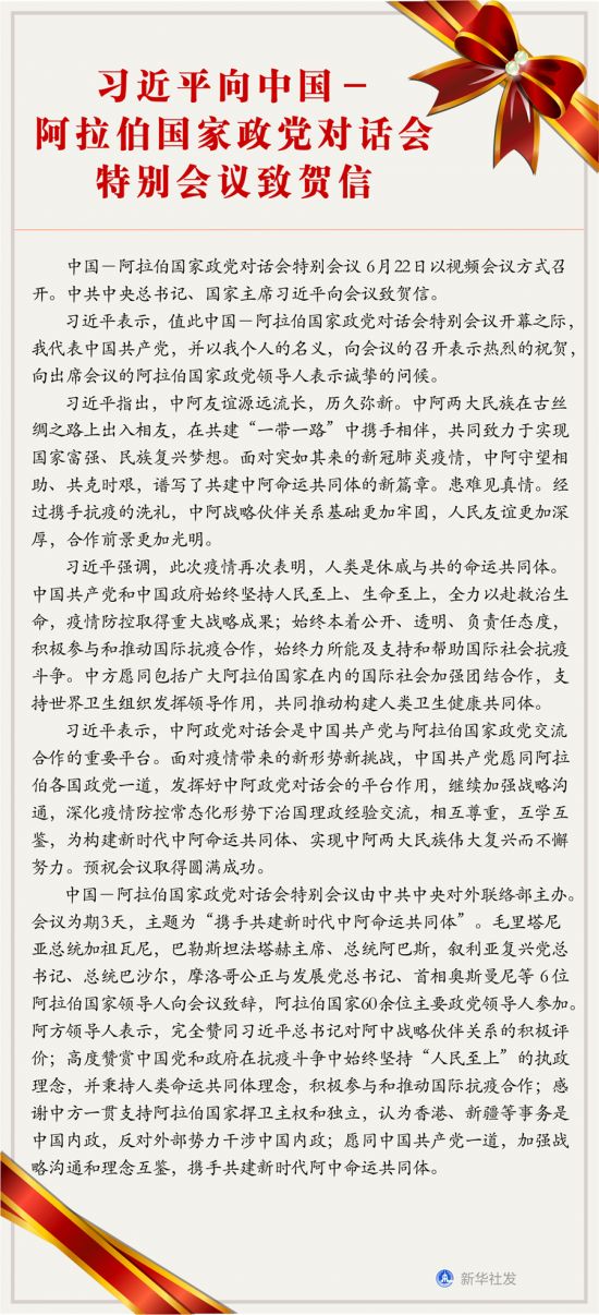 新华社北京6月22日电 中国-阿拉伯国家政党对话会特别会议22日以视频会议方式召开。中共中央总书记、国家主席习近平向会议致贺信。