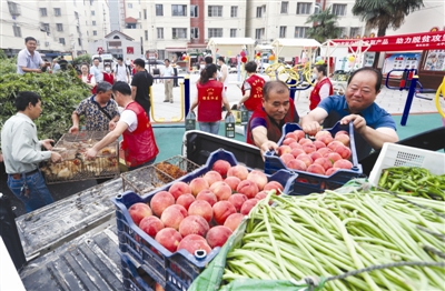 6月24日上午,南谯区银东社区文化广场贫困户农副产品扶贫销售摊点,居民们在选购优质的绿色农副产品。