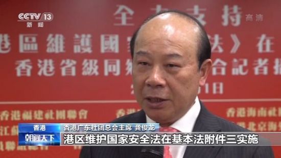 香港广东社团总会主席 龚俊龙:广东社团总会坚定支持港区维护国家安全法在基本法附件三实施,该法能够有效打击极少数人,从事危害国家安全行为的犯罪,还香港一个繁荣稳定,我们坚定支持。