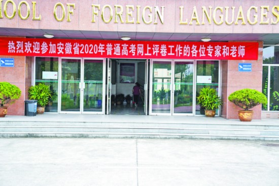 7月9日,记者来到今年安徽高考的阅卷点之一——安徽农业大学的外国语学院楼外,这里已经悬挂起“欢迎参加安徽省2020年普通高考网上评卷工作的各位专家和老师”的标识牌,楼内外的工作人员也正在进行阅卷点内的消毒工作。