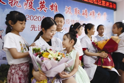 7月9日,南谯区银东社区,余友琴、马长欣、胡慧文等三位援鄂医务人员、“滁州好人”为社区小朋友们讲述他们在抗“疫”一线与时间赛跑、与疫情决战、与病毒抗争的故事。