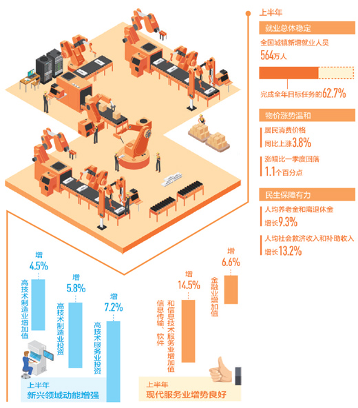新经济蓬勃发展,动能转换态势好。远程办公、在线教育、智能施工、无人配送等新模式有效化解了市场的堵点、难点;云计算、大数据、人工智能为代表的新技术快速发展;数字经济、智能制造、生命健康等新产业形成了更多增长极……上半年,我国高技术制造业和高技术服务业投资分别增长5.8%和7.2%,其中电子商务服务业、科技成果转化服务业投资分别增长32%、21.8%。新产业新业态新模式孕育壮大,将为经济回升继续提供有力支撑。