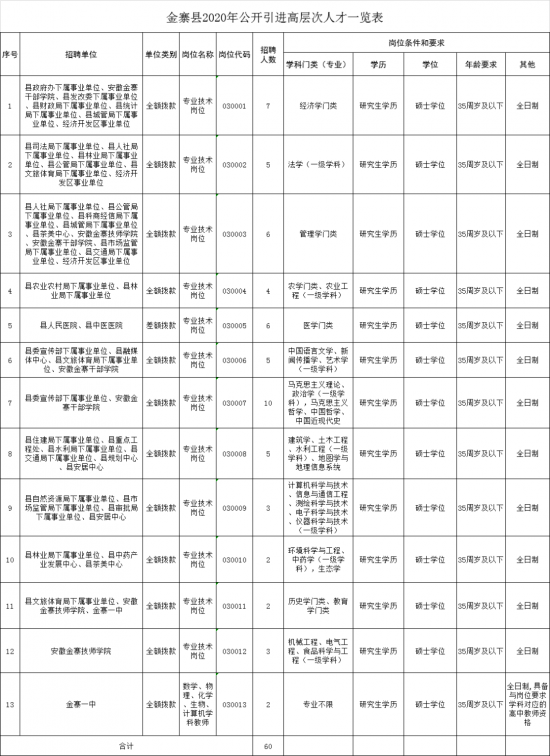 六安市金寨县高层次人才引进60人