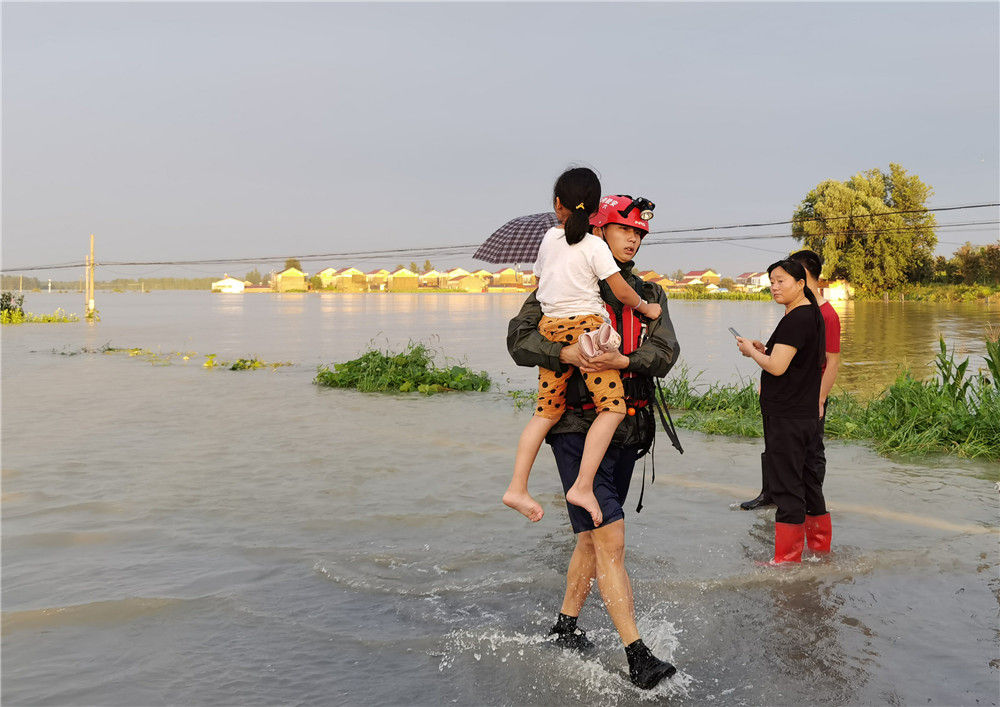 7月19日,安徽六安市金安区皋城路消防救援站消防员马昌杰在金安区双河镇曹堰村救援现场转移村民。新华社记者 朱青 摄
