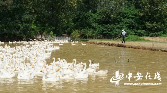 中安在线、中安新闻客户端讯 8月4日上午,尽管烈日当头,户外暑气逼人,但王家坝镇的养鹅大户王玉敏蹲在树荫下,笑眯眯地看着池塘里2000多只大白鹅,满心欢喜。在这次洪灾中,他搭建的鹅棚虽然被冲毁,但养殖的大白鹅被安全转移到了保庄圩内,也保住了生产自救的希望。