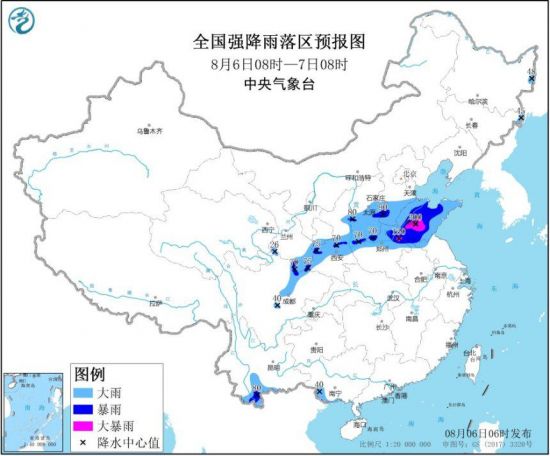 预计,8月6日08时至7日08时,甘肃东南部、陕西中南部、华北南部、黄淮中北部、四川盆地西部、云南南部、广西南部等地的部分地区有大到暴雨,其中,河南东部、山东中西部等地局地有大暴雨(100~200毫米)。上述部分地区伴有短时强降水(最大小时降雨量30~50毫米,局地可超过70毫米),局地有雷暴大风等强对流天气。