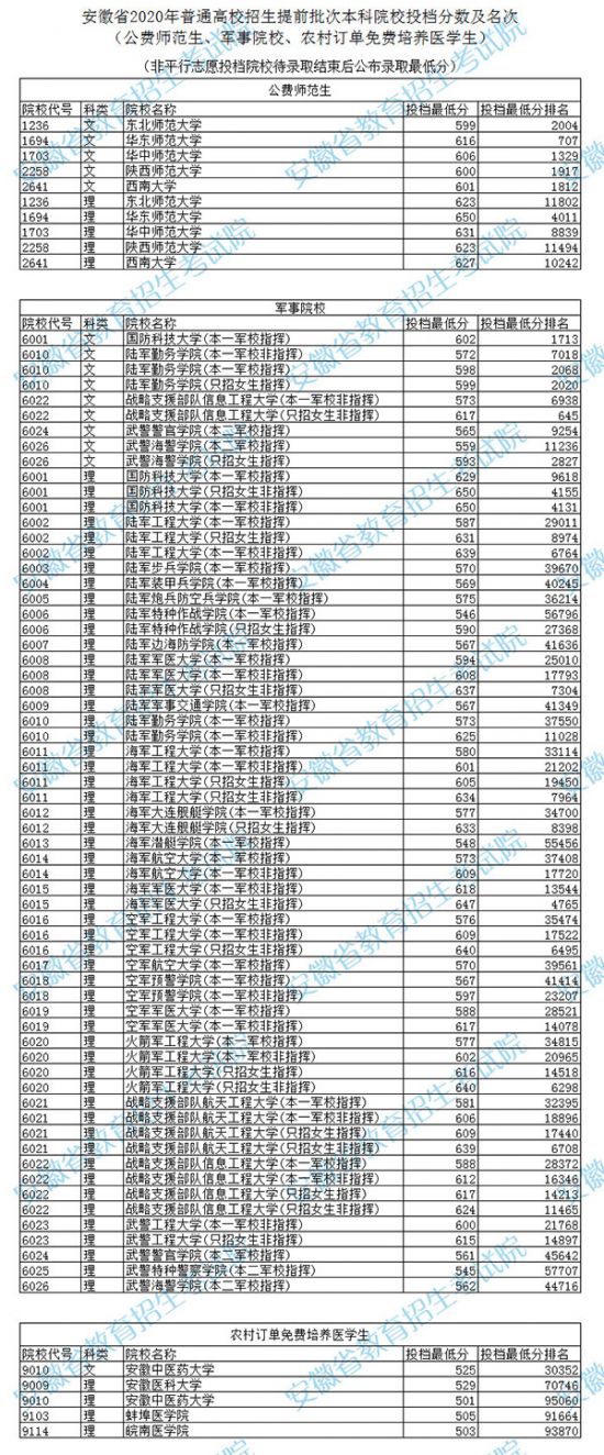 人民网合肥8月9日电(汪瑞华)今天上午,安徽省教育招生考试院公布2020年普通高校招生提前批次本科院校投档分数及名次。