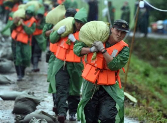 和平年代,面对波涛汹涌的洪水,解放军官兵、民兵、消防救援人员紧急抢险救灾。老百姓则纷纷走出家门,给抢险救灾人员送去食物,送去温暖:
