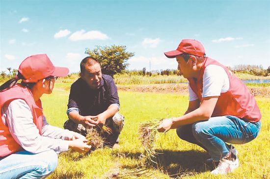 滁州市南谯区乌衣镇法华村大郭村民组贫困户周正海,通过区、镇、村帮扶干部共同努力,承包土地20余亩,种植草皮,每年收益7万元左右。图为近日周正海(中)和帮扶干部实地察看草皮的种植情况。 本报记者 胡娅莉 本报通讯员 李永斌 摄