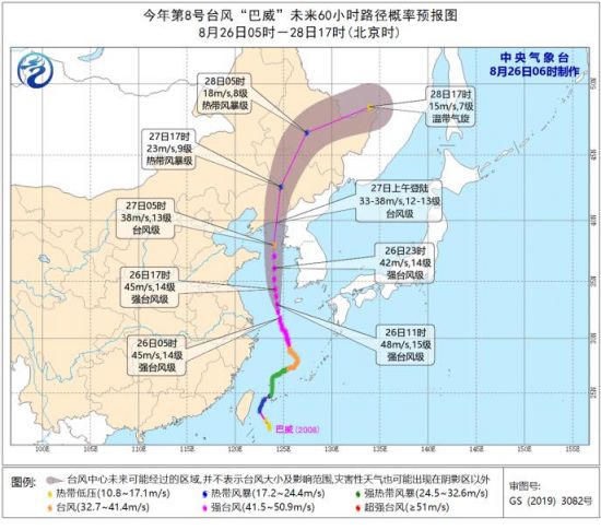 预计,“巴威”将以每小时20-25公里的速度向偏北方向移动,强度维持或略有增强;即将移入黄海南部,移速逐渐加快,26日晚上开始强度有所减弱;将于27日上午在辽宁东部到朝鲜西部一带沿海登陆(台风级,12-13级,33-38米/秒),登陆后逐渐转为北偏东到东北方向移动,强度逐渐减弱,并将变性为温带气旋。