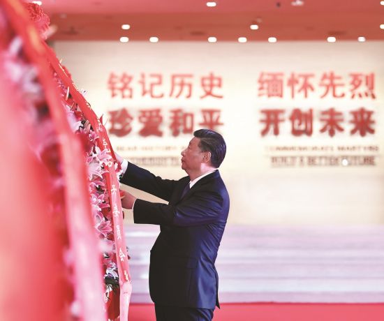 9月3日上午,习近平、李克强、栗战书、汪洋、王沪宁、赵乐际、韩正、王岐山等党和国家领导人来到中国人民抗日战争纪念馆,出席纪念中国人民抗日战争暨世界反法西斯战争胜利75周年向抗战烈士敬献花篮仪式。这是习近平整理花篮上的缎带。