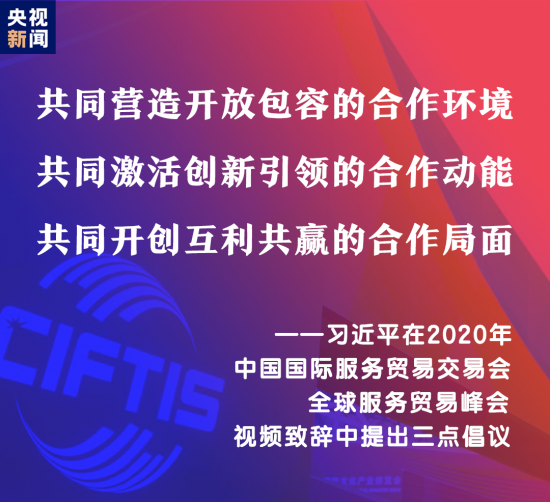 习近平表示,中国举办2020年中国国际服务贸易交易会,就是搭建起平台和桥梁,让各国人民充分展示服务贸易领域新发展新突破,共同享受人类社会发展进步新技术新成果。