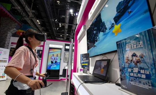 △2020年服贸会综合展区,参观者正在体验VR互动游戏。