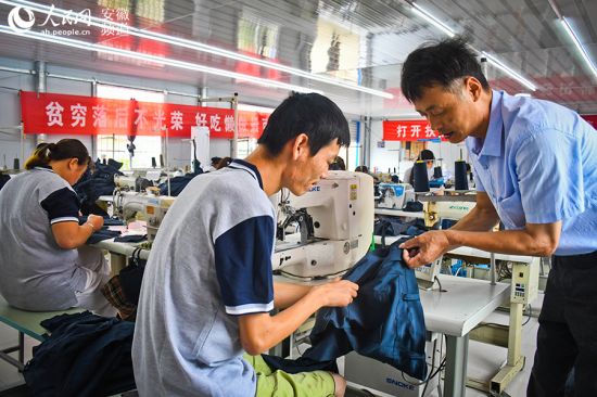 在明光市的扶贫车间里,技术人员正在指导贫困户缝纫技术,培养一技之长。周坤摄。