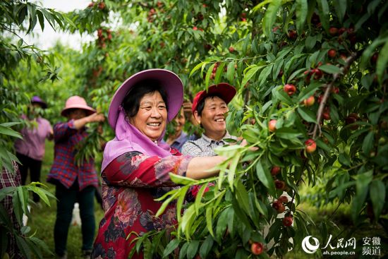 来安县施官镇桃丰扶贫产业园内,红彤彤的蟠桃挂满了枝头。来安县委宣传部供图