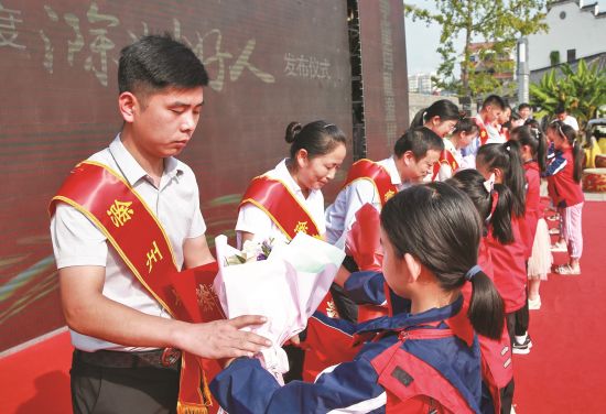 滁州网讯 今年9月20日是第十八个全国“公民道德宣传日”,9月16日,由市文明办、琅琊区文明委主办,琅琊区丰山街道承办的滁州市2020年“9·20公民道德日”主题活动暨二季度滁州好人发布仪式在琅琊区古玩城广场举行。活动对部分滁州市文明家庭代表、道德模范代表等进行了表彰,并通过播放宣传视频、文艺表演等方式,大力弘扬中华民族传统美德和社会主义核心价值观,广泛动员社会各界和市民群众积极参与公民道德建设。图为:学生们向二季度滁州好人敬献鲜花。
