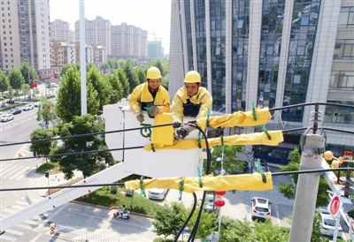 9月9日,在安徽省天长市广陵路,天长市供电公司带电作业班人员在高空对一处电网线路进行带电抢修,确保企事业单位和百姓用电不受影响。入秋以来,天长市出现连续高温天气,电网负荷急剧攀升。为保障电网安全运行,该公司积极采用带电作业方式对重点线路、设备进行检修。