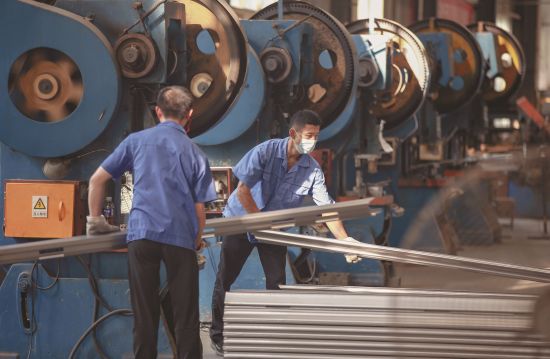 图为9月12日,工人们在安全门生产线上作业。记者卢志永摄