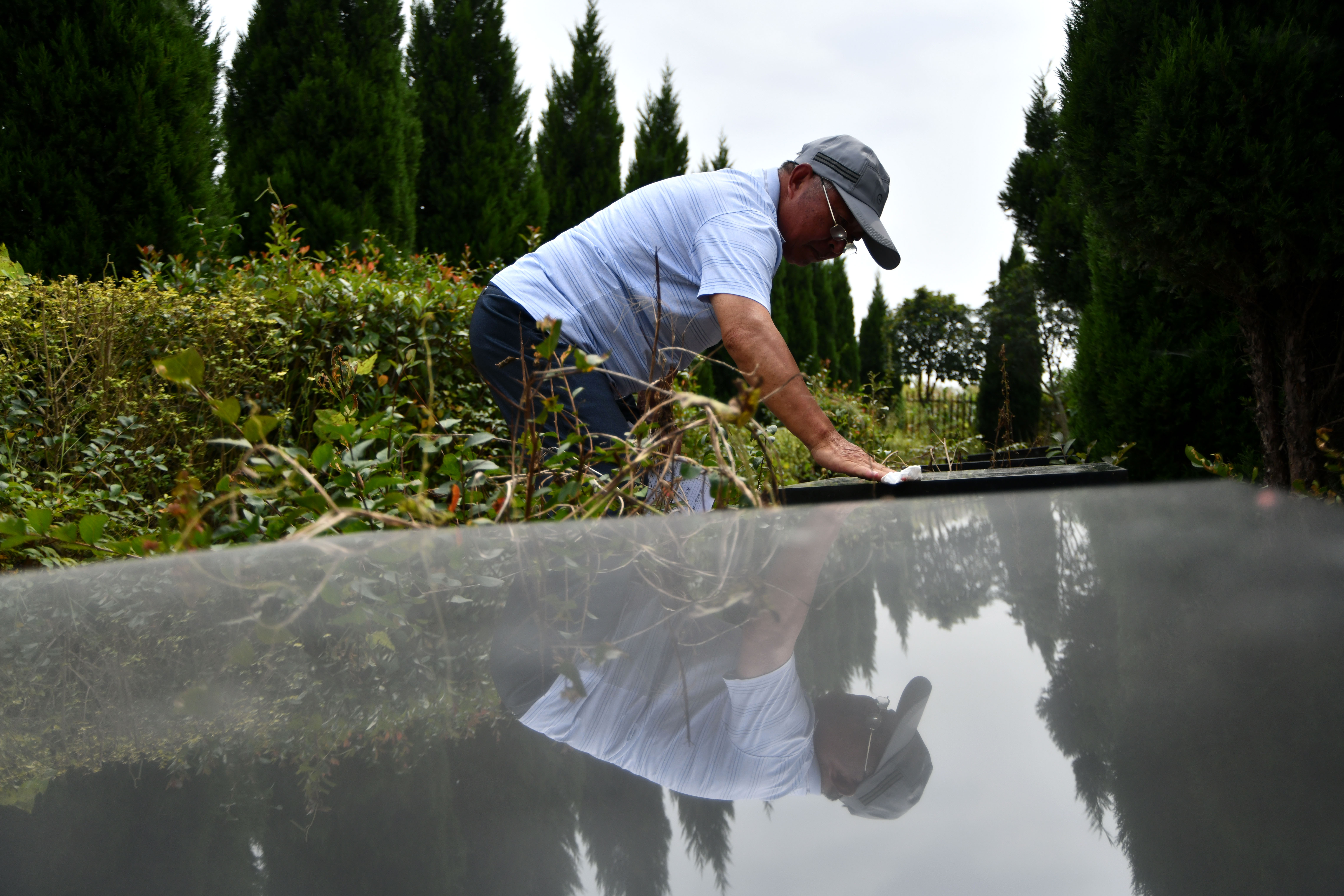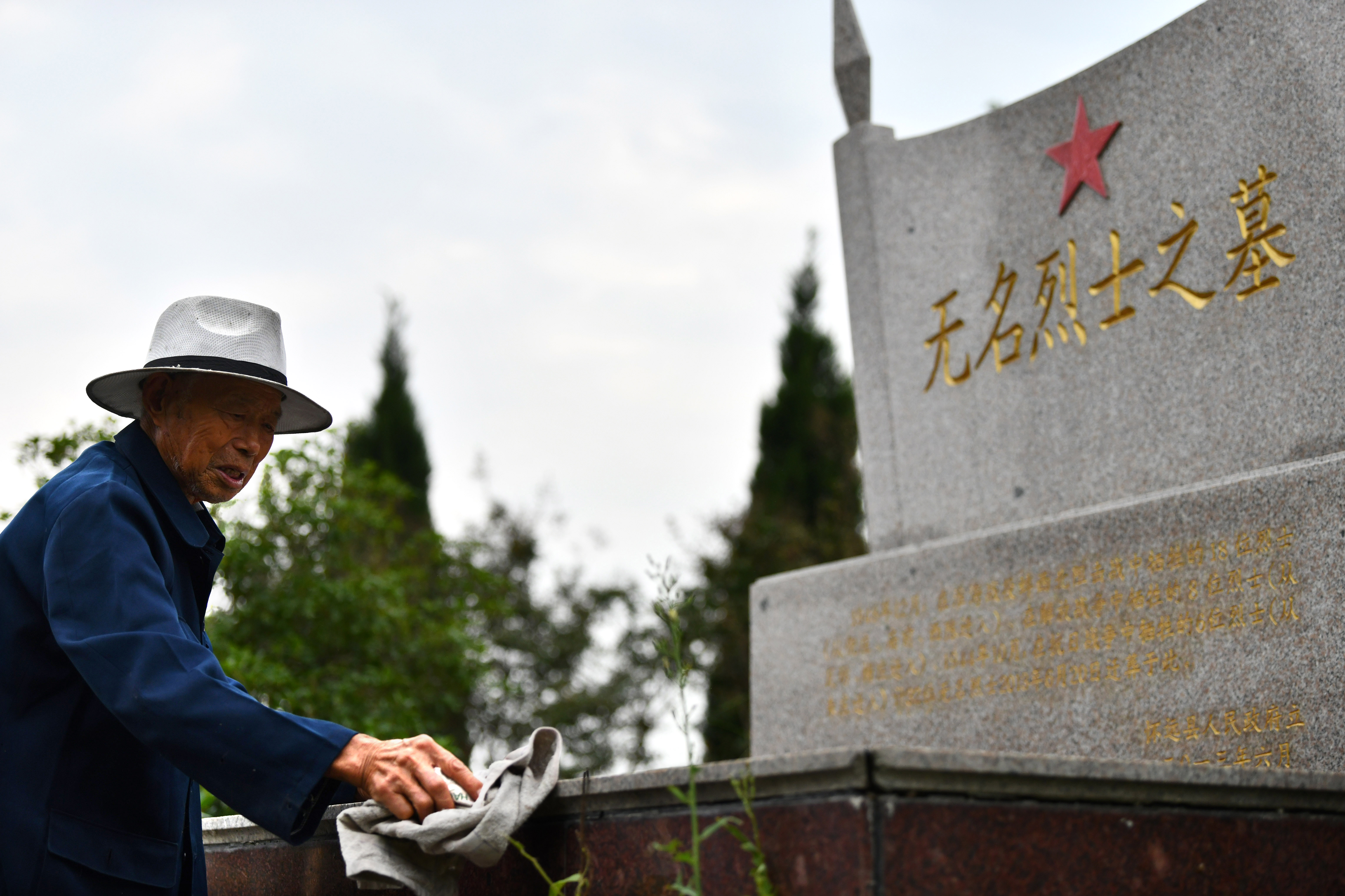 ↑胡兆伦在擦拭无名烈士墓(9月15日摄)。
