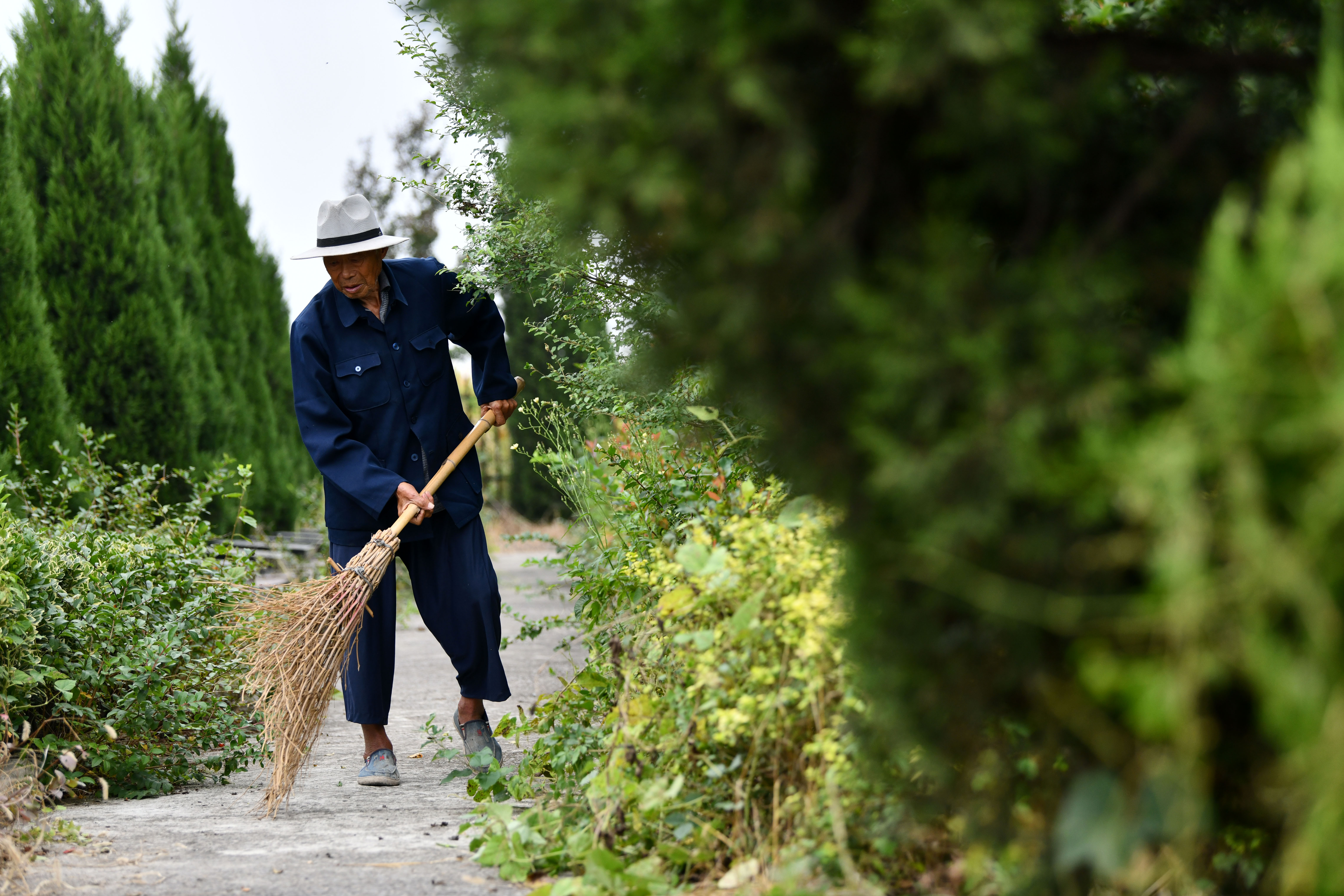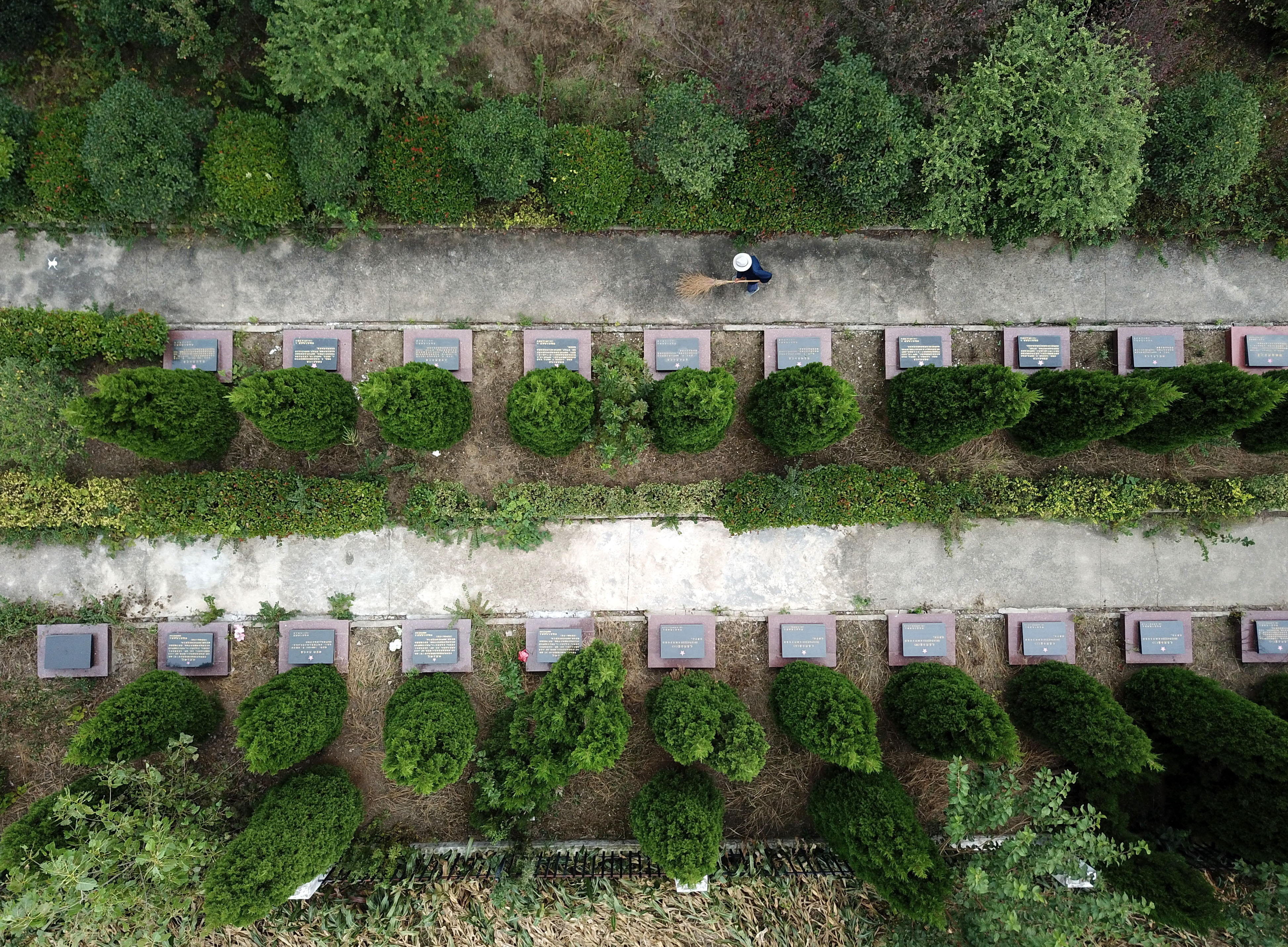 ↑胡兆伦在清扫烈士陵园(9月15日摄,无人机照片)。