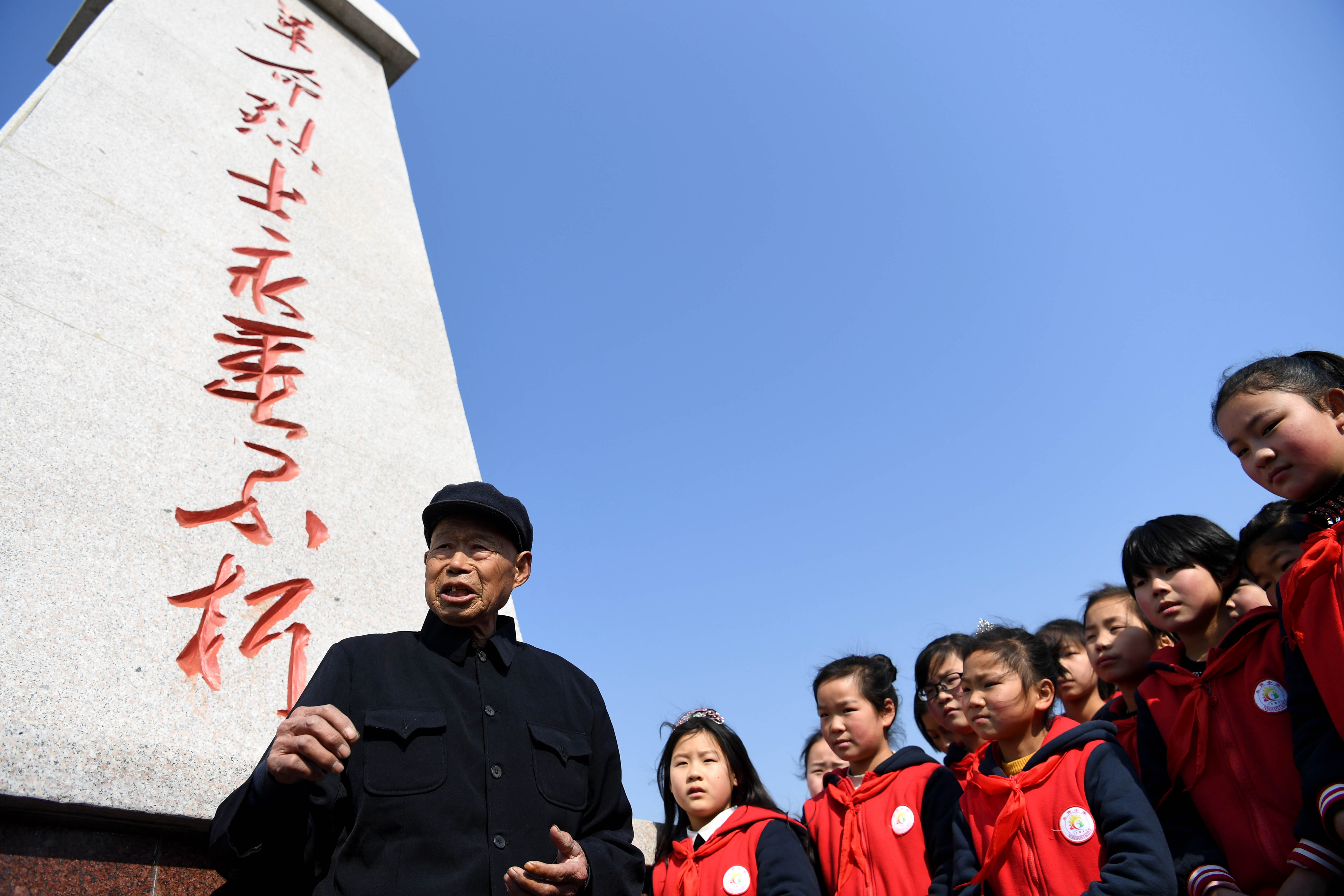 ↑胡兆伦在烈士陵园为小学生讲述烈士的事迹(2019年3月14日摄)。