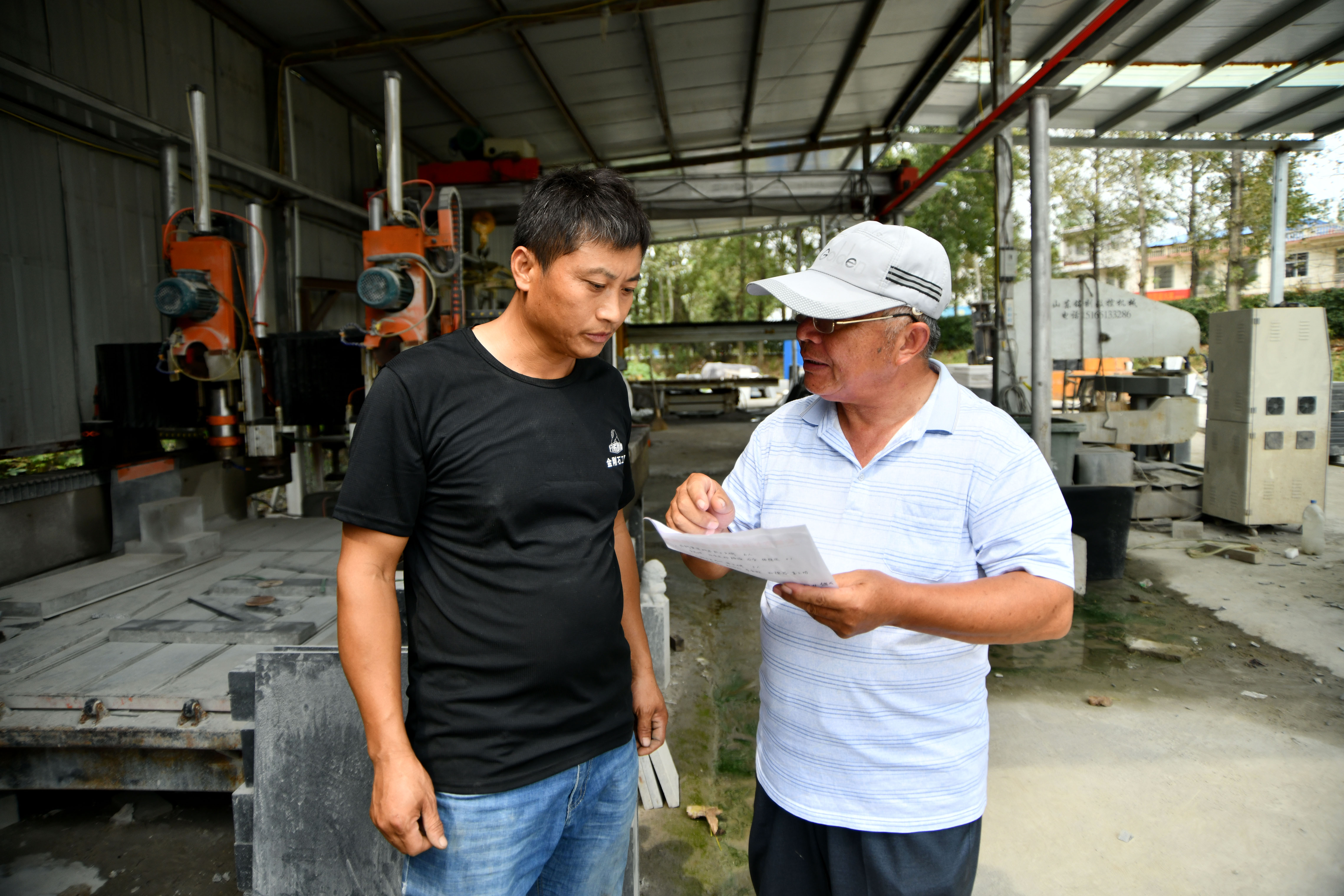 ↑年介涛将新复原姓名的烈士信息告诉碑文雕刻者(9月16日摄)。