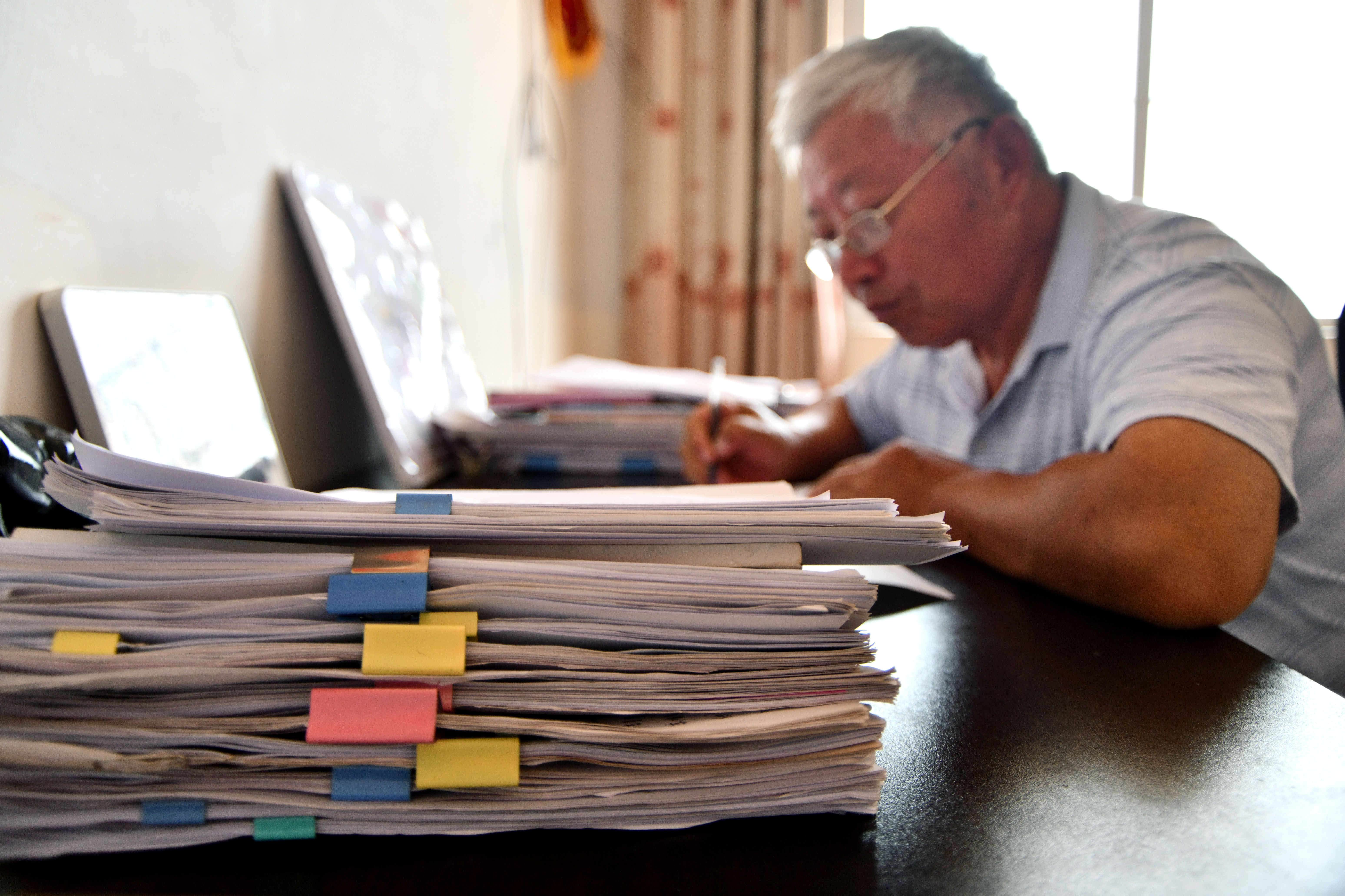 ↑年介涛在家里翻阅烈士信息资料(9月15日摄)。