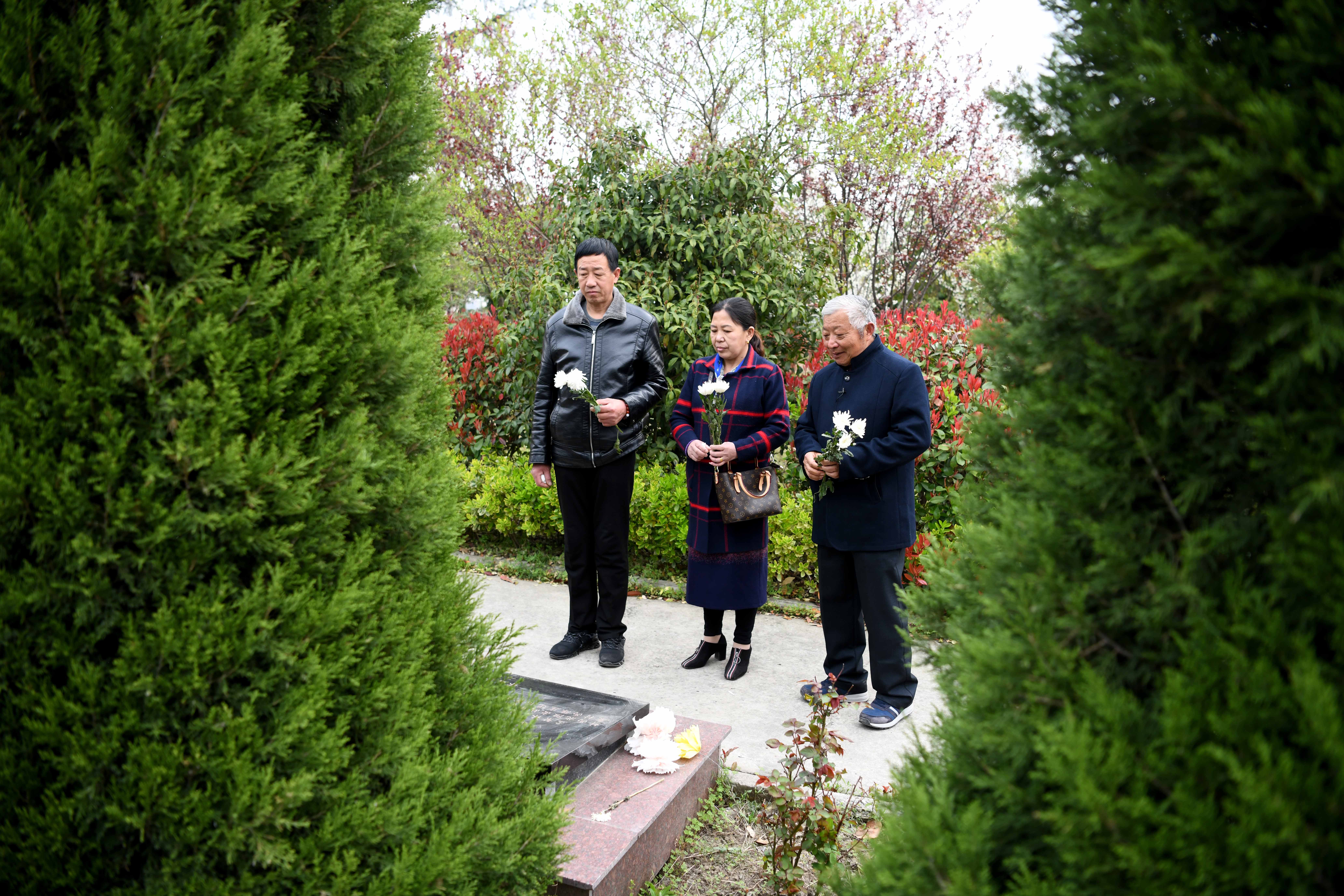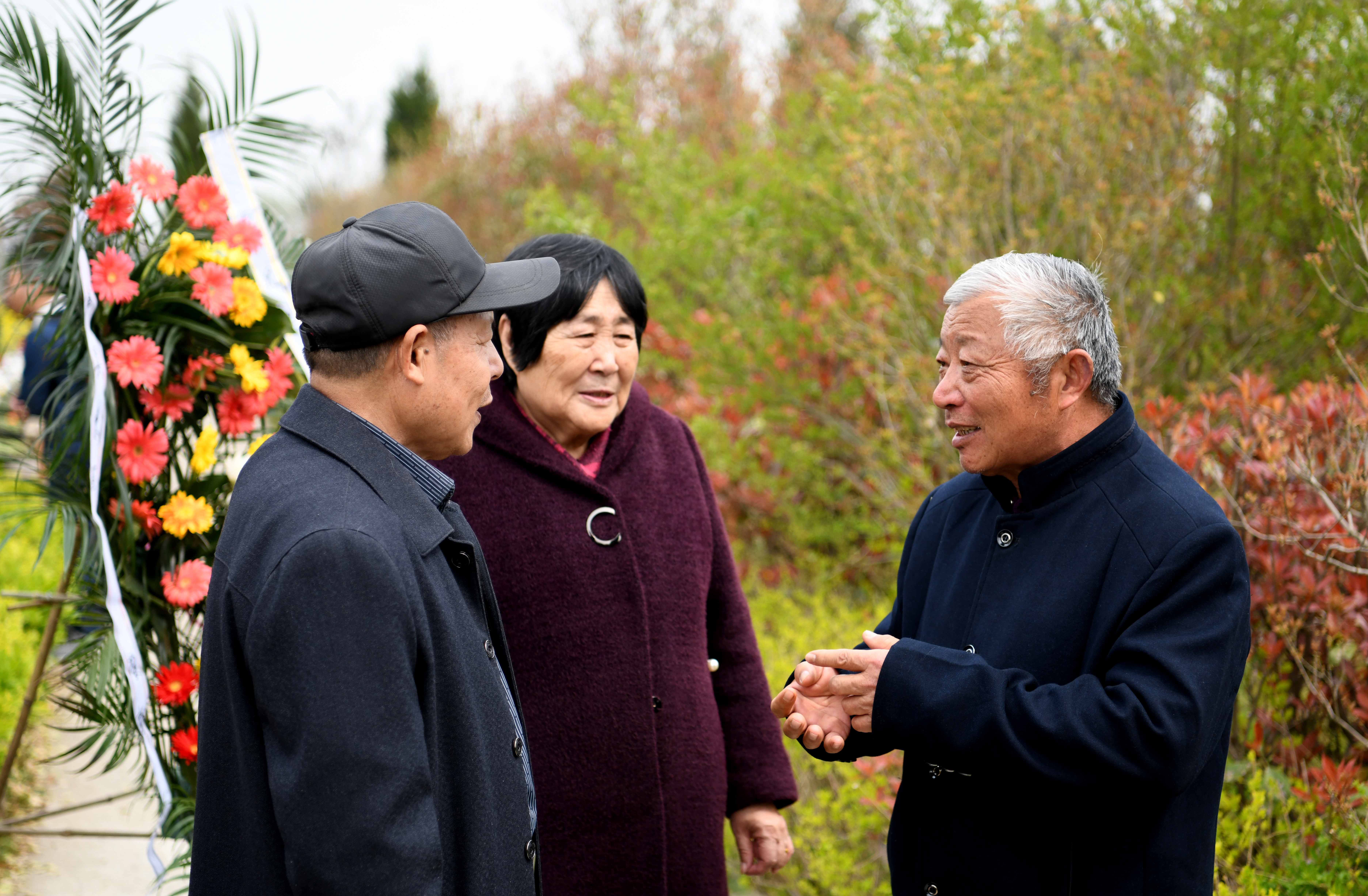↑年介涛(右)在胡刘烈士陵园向吴忠歧烈士的弟弟吴忠臣(左)和弟媳介绍吴忠歧烈士的事迹。年介涛于2019年2月为吴忠歧烈士找到河北沧州的亲人(2019年4月2日摄)。