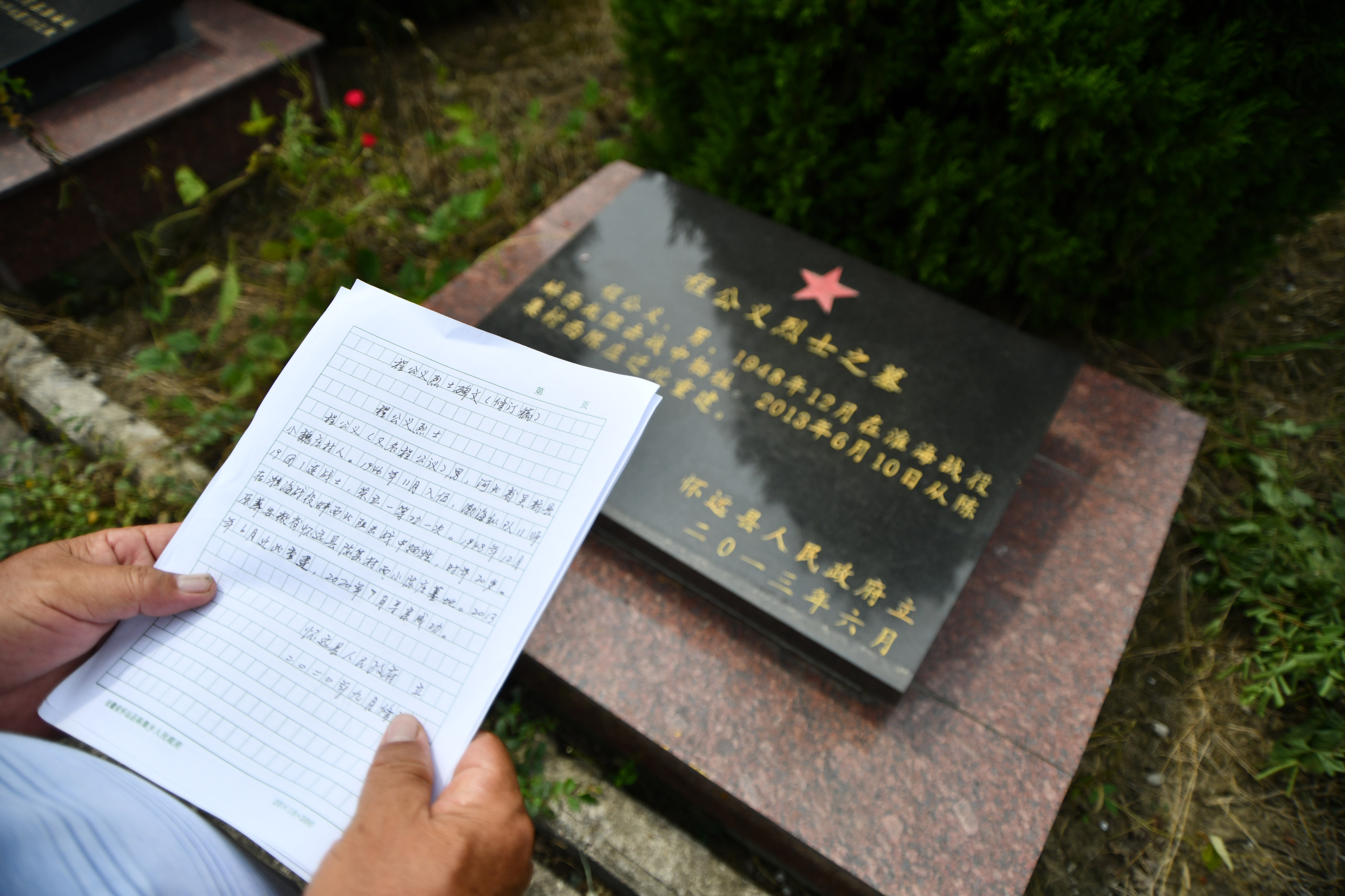 ↑年介涛在胡刘烈士陵园里对比完善后的烈士碑文信息(9月16日摄)。