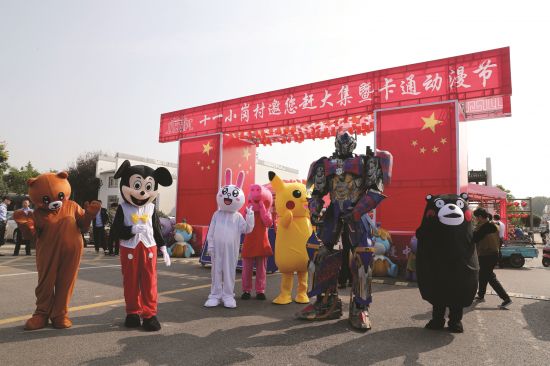10月1日,凤阳县小岗村举办为期7天的“十一小岗村邀您赶大集”暨卡通动漫节活动。活动以“农旅融合促发展·产业兴旺奔小康”为主题,通过文化演出、地摊经济、美食游乐、动漫拓展等多项元素,以节兴旅、以旅兴农,为小岗村农旅融合发展注入新活力。图为友谊大道彩虹门前,儿童卡通动漫气模展及真人机器人秀表演正在进行。 记者李晓村摄