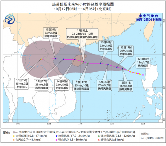 大风预报:受南海热带低压和冷空气的共同影响,12日08时至13日08时,台湾海峡、巴士海峡、南海北部和中部偏北海域、北部湾、西沙群岛附近海域、海南沿海和广东沿海将有6-7级大风,其中南海北部的部分海域和海南岛东部沿海风力可达8-9级、阵风10-11级。