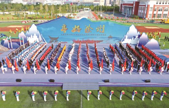 10月19日下午,省第五届全民健身运动会在滁州职业技术学院正式拉开帷幕。整场开幕式分为暖场表演、开幕仪式、文体表演三大部分。本届全民健身运动会共有33个竞赛项目和1个展演项目,16个市和省直机关体育联合会共17个代表团报名参赛。 全媒体记者计成军 卢志永 摄
