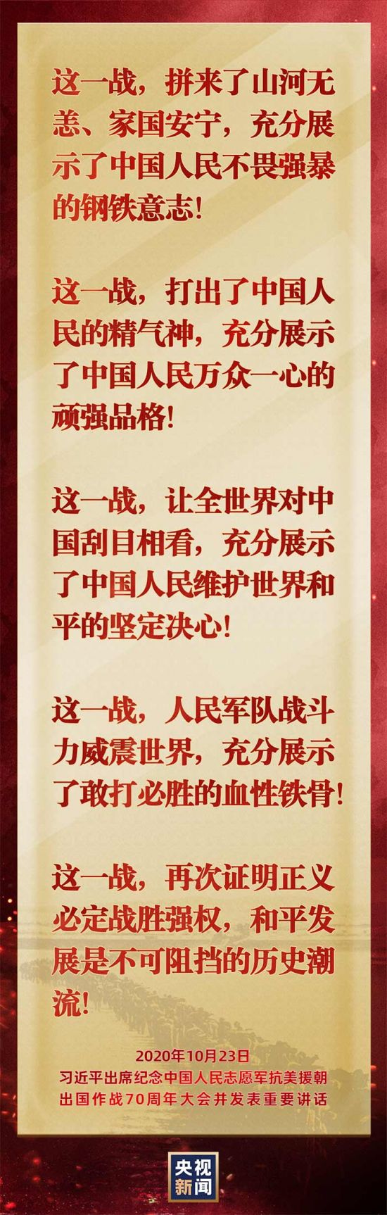 习近平这些话,让每个中国人热血沸腾! 2020-10-24 08:49 央视新闻客户端 扫描到手持设备 字号: 纪念中国人民志愿军抗美援朝出国作战70周年大会今天上午在北京人民大会堂隆重举行,习近平发表重要讲话。 在困难和风险面前,中国人民是什么样的?这些回答掷地有声,让每个中国人热血沸腾! 相关阅读 关键词: artivzwtxllpiipwclxg oz 责任编辑:郑安杰 复制网址 打印 收藏 关于我们 | 联系我们 | 加入我们 | 版权声明 | 手机访问 | 网站地图 | 留言反馈 | 我要投稿 中共滁州市委宣传部主办 滁州日报社承办 Copyright?2009-2010 Chuzhou.cn. All Rights Reserved 滁州日报社 版权所有 皖网宣备3412015001号 皖ICP备11004325号-1 热线电话:0550-3022685