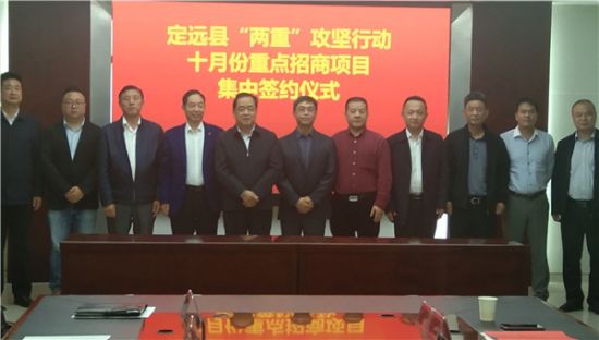 10月30日,定远县举行“两重”攻坚行动10月份重点招商项目集中签约仪式,参加本次集中签约的项目共5个,协议总投资23.2亿元。市、县领导万瑞健、邹军、陈国祥、范泽斌、陶学功、王俊卿、李大明及投资项目代表出席签约仪式。