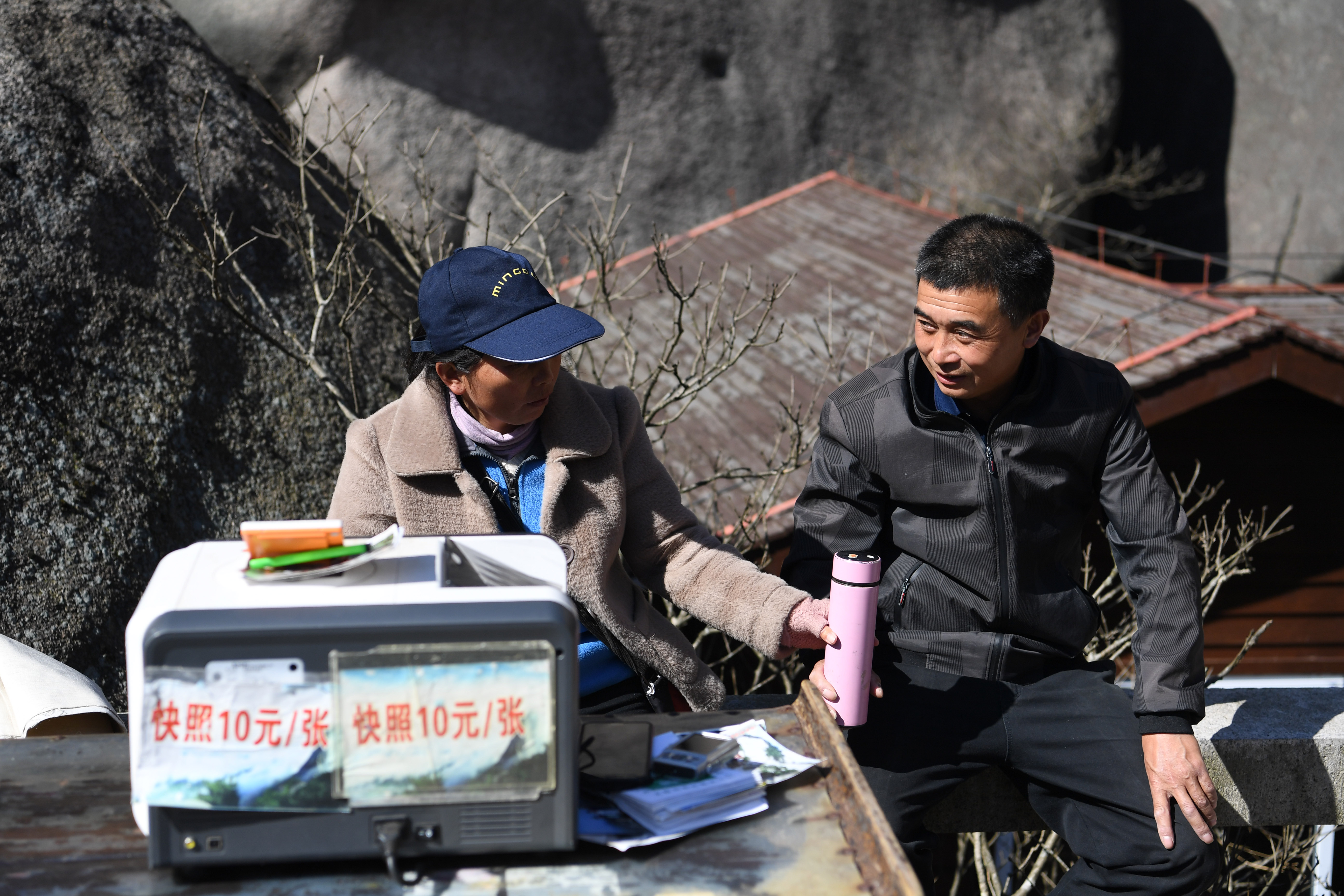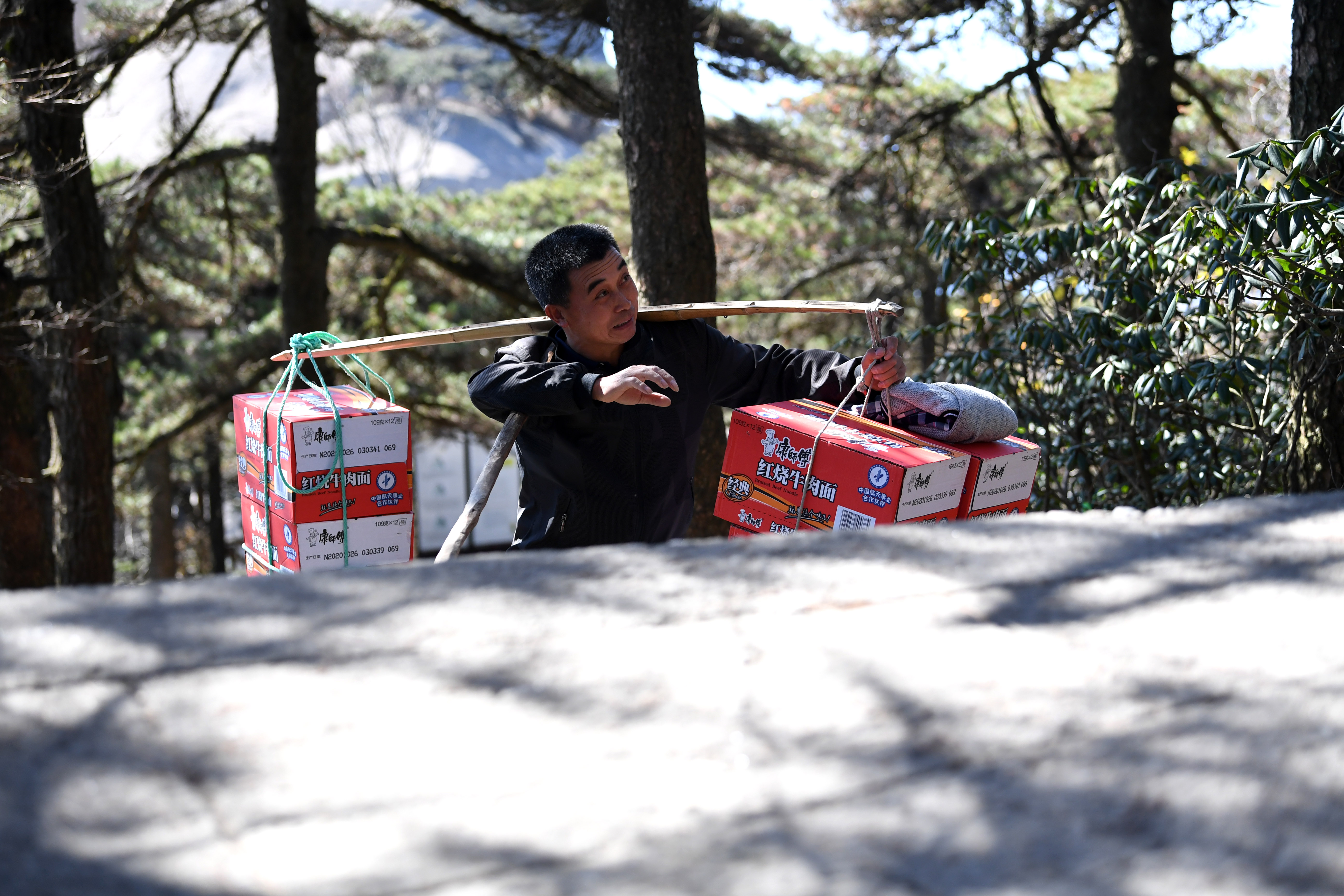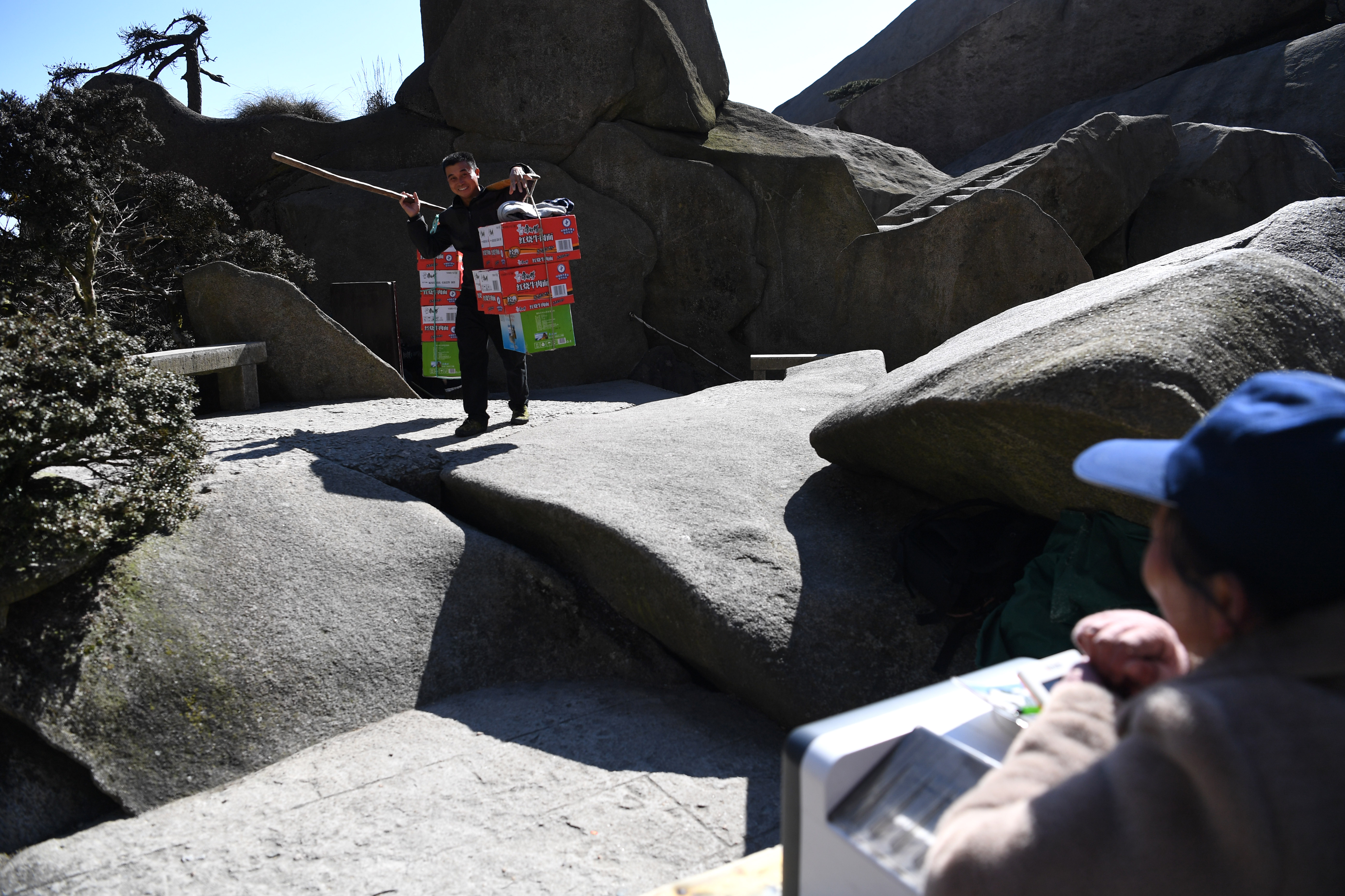 在山上的工作平台,杨月红一待就是大半天,除了期待大量的游客,她还期待遇到做挑山工的丈夫徐胜利。“以前挑建筑材料,现在挑生活物资”,从天柱山振衣岗到天池峰,肩挑约100斤物资,上行1300多级台阶,对于48岁的“资深”挑山工徐胜利来说,并不轻松。一步一个台阶,左右替换肩膀,一趟下来,即使冬天也会大汗淋漓。“再累也要坚持,我知道她在山上等我”,徐胜利最期待的,是登顶之前与杨月红“相遇”。